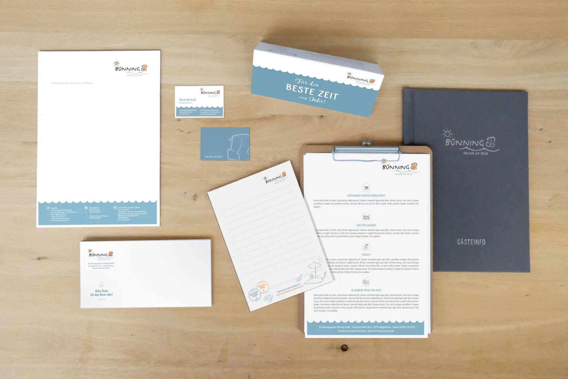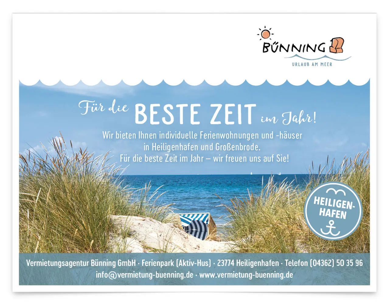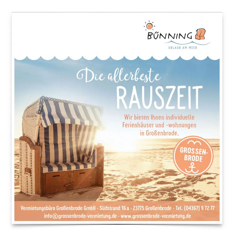 Seit über 25 Jahren steht für die Vermietungsagentur Bünning die Zufriedenheit ihrer Kunden an erster Stelle. Im Portfolio stehen Ferienwohnungen und -häuser in Heiligenhafen und Großenbrode. Mit dem Relaunch des Kataloges hat 2017 unser erstes gemeinsames Projekt begonnen. Neben dem Design haben wir hier auch die Artdirektion für das Fotoshooting übernommen.